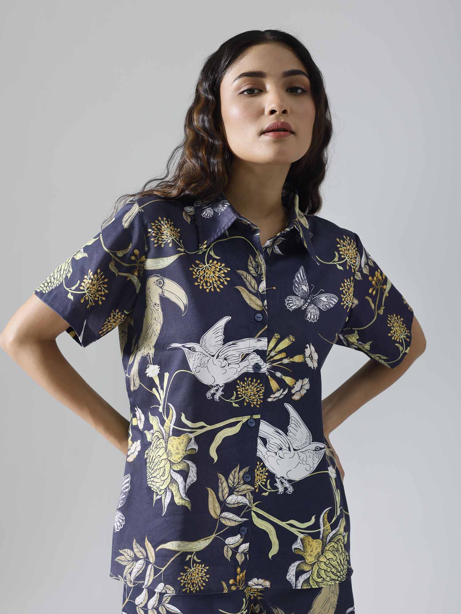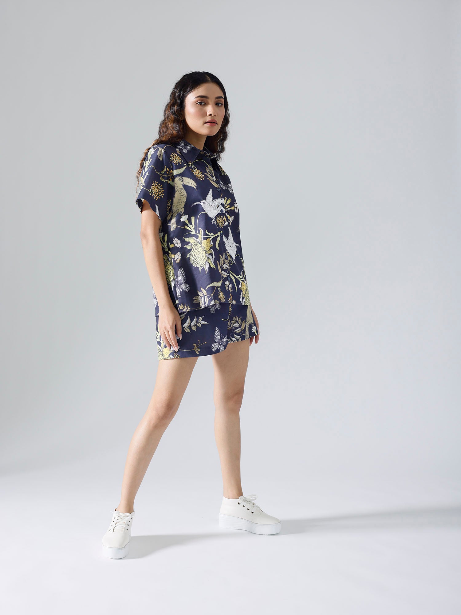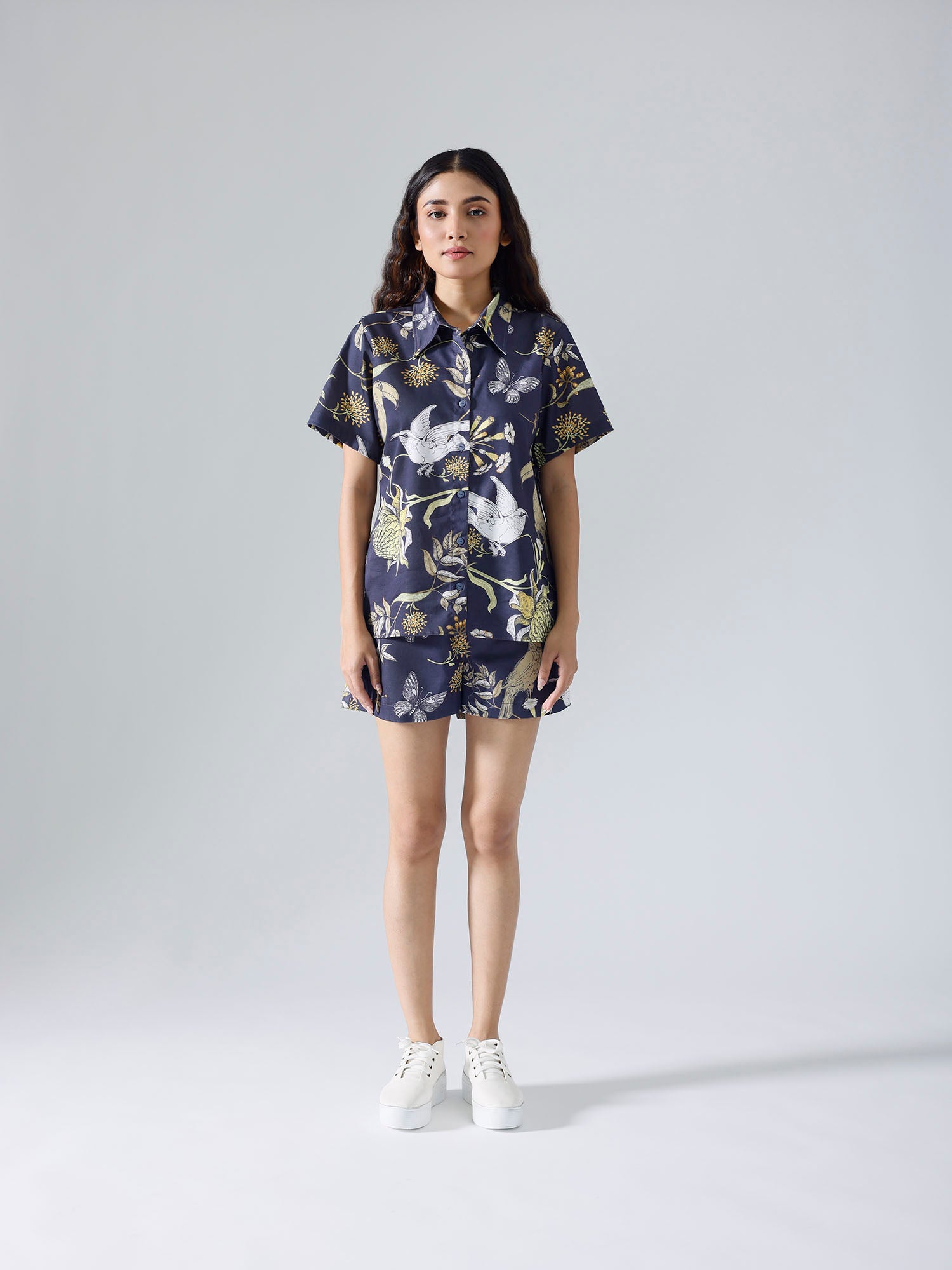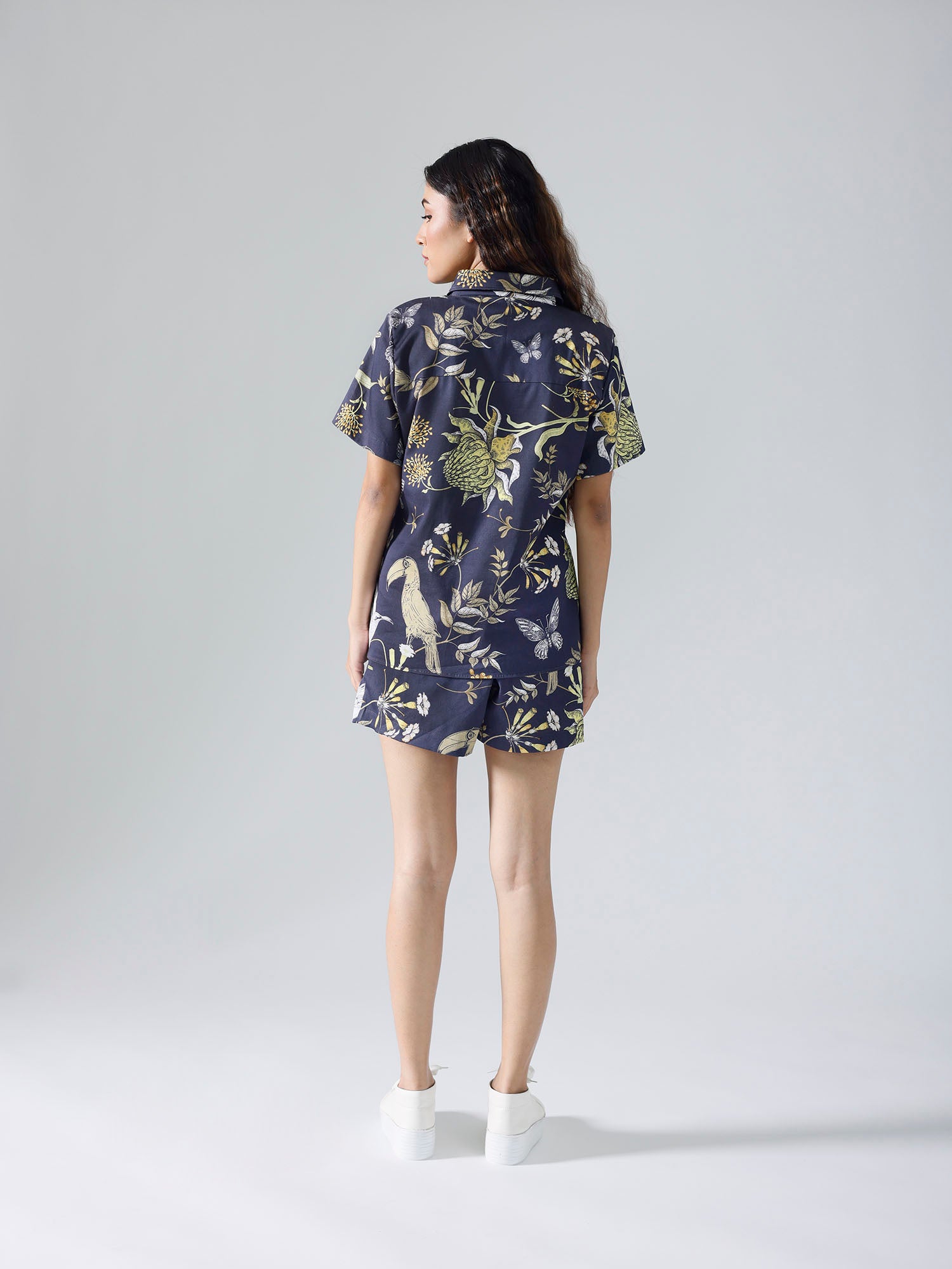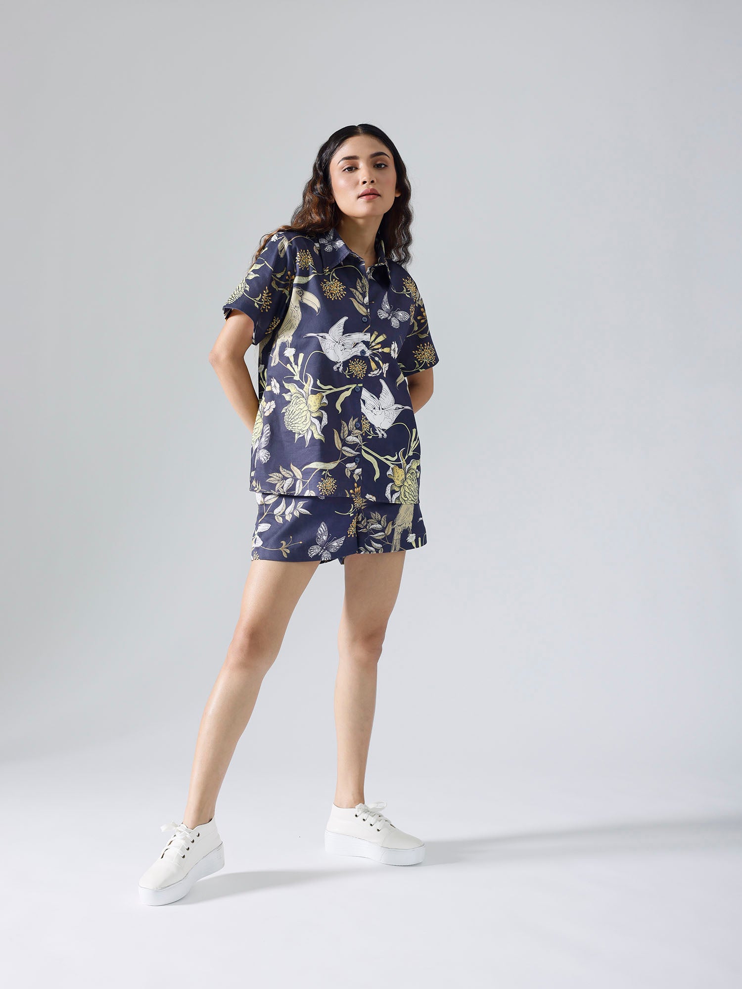 Printed co-ordinated shorts set. Sold as a set of 2. Three fourth sleeve top. Shorts with pocket and back elastic. Zip fly fastening with a single hook fastening on one side. Mid rise. Regular fit.