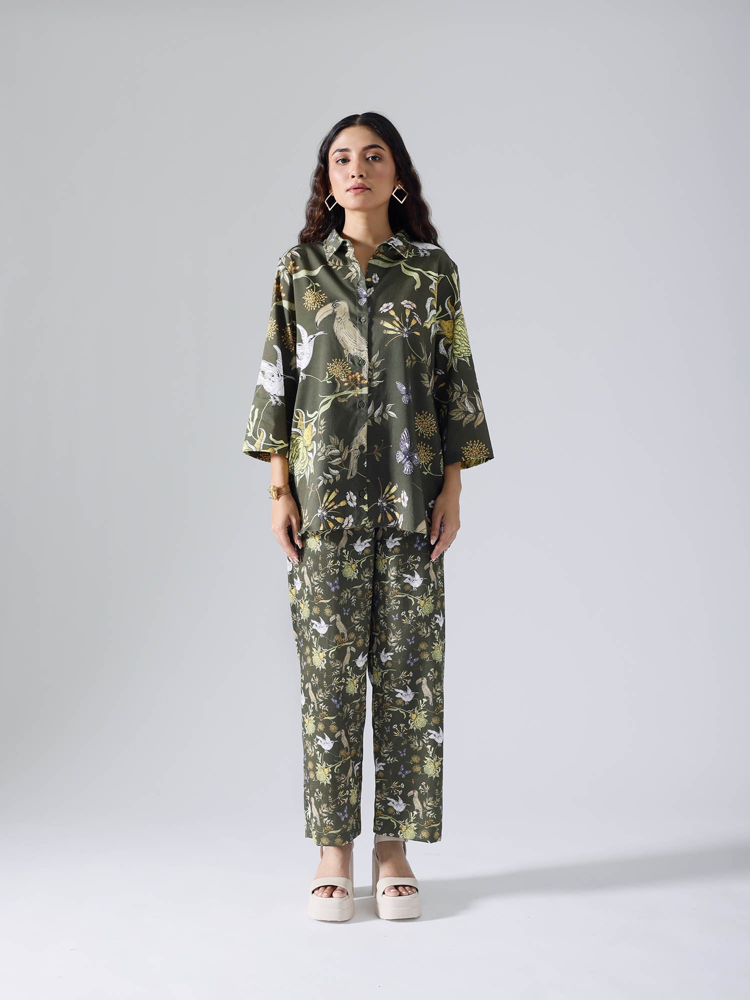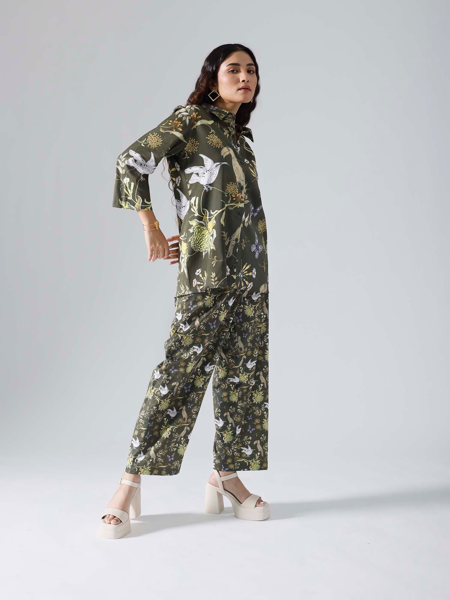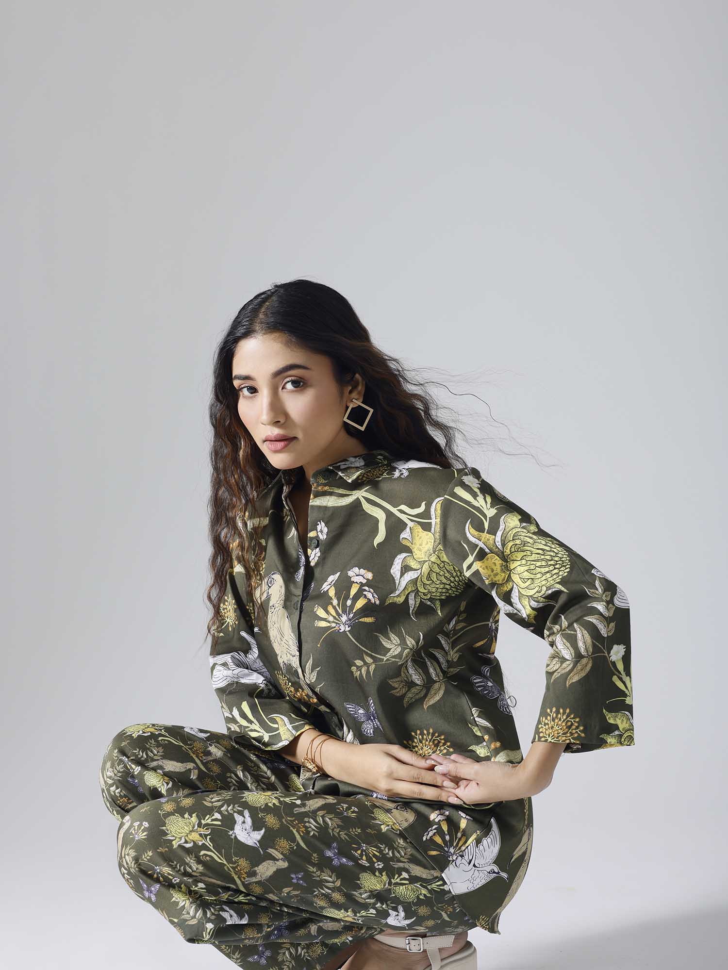 Printed over sized set. Sold as a set of 2. Full sleeve shirt with front buttons. Pants with pocket and back elastic. Zip fly fastening with a single hook fastening on one side. Mid rise. Regular fit.