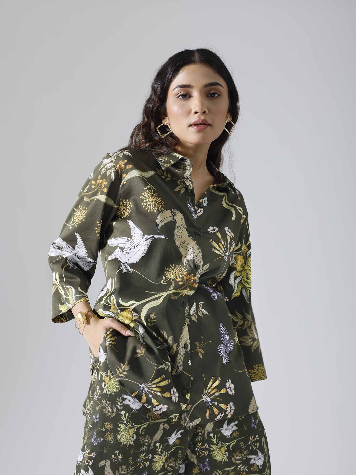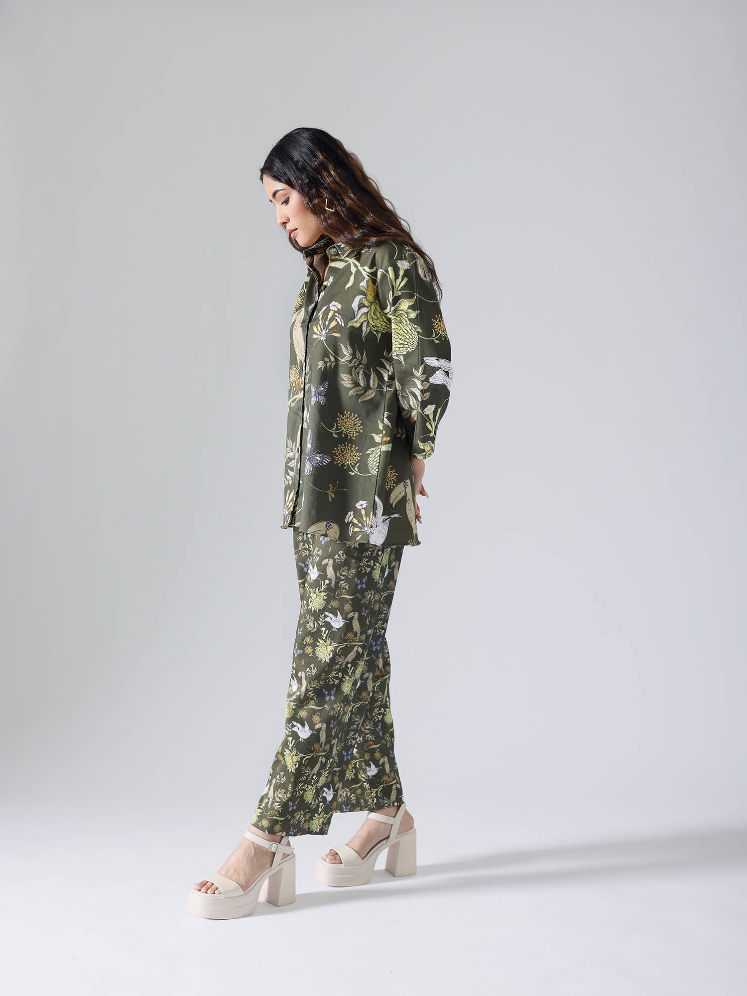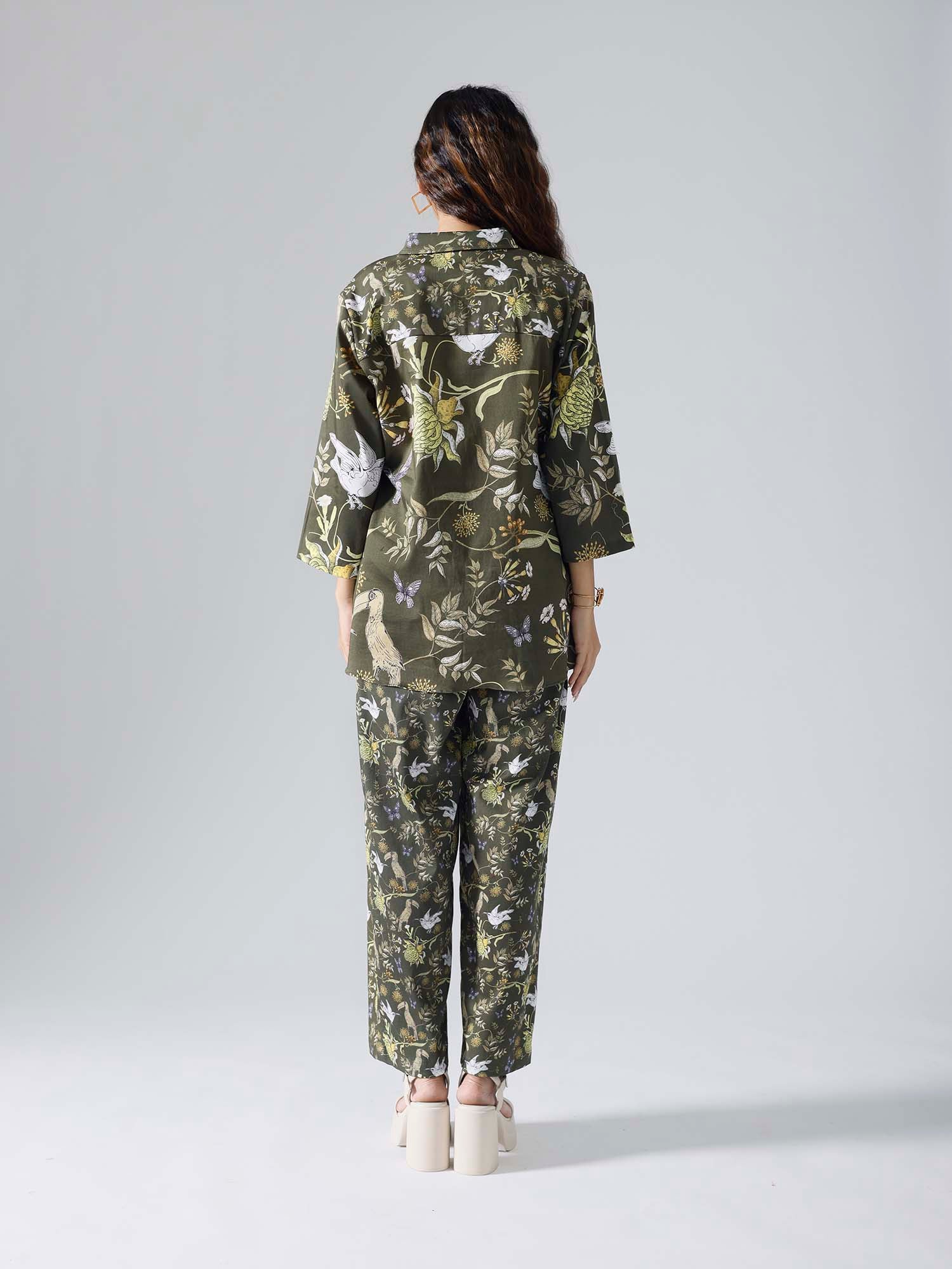 Printed over sized set. Sold as a set of 2. Full sleeve shirt with front buttons. Pants with pocket and back elastic. Zip fly fastening with a single hook fastening on one side. Mid rise. Regular fit.