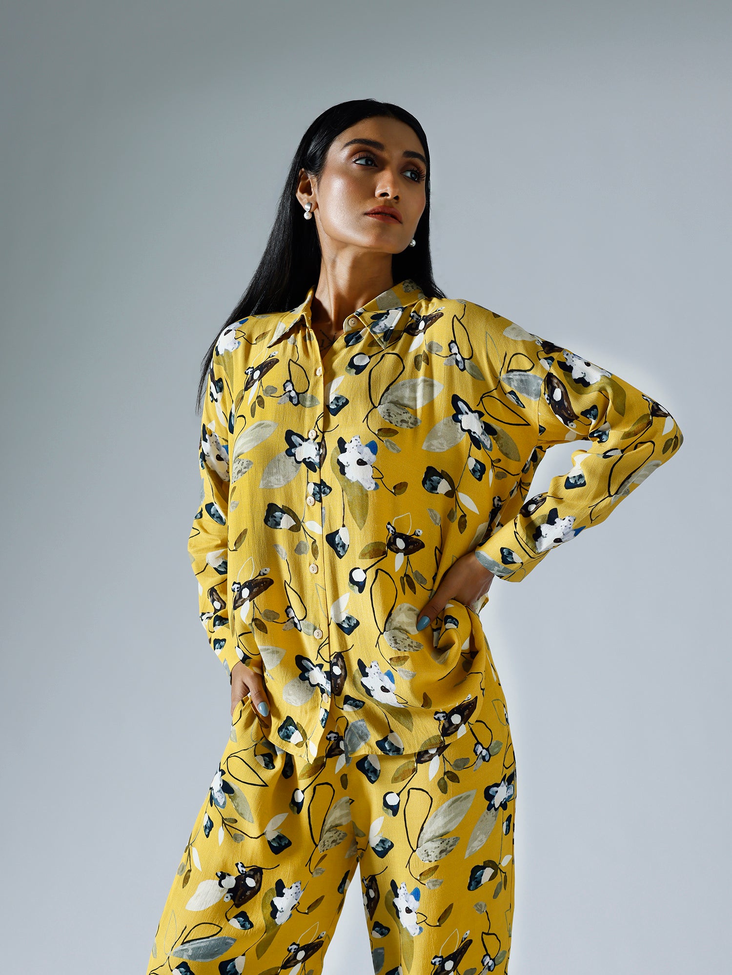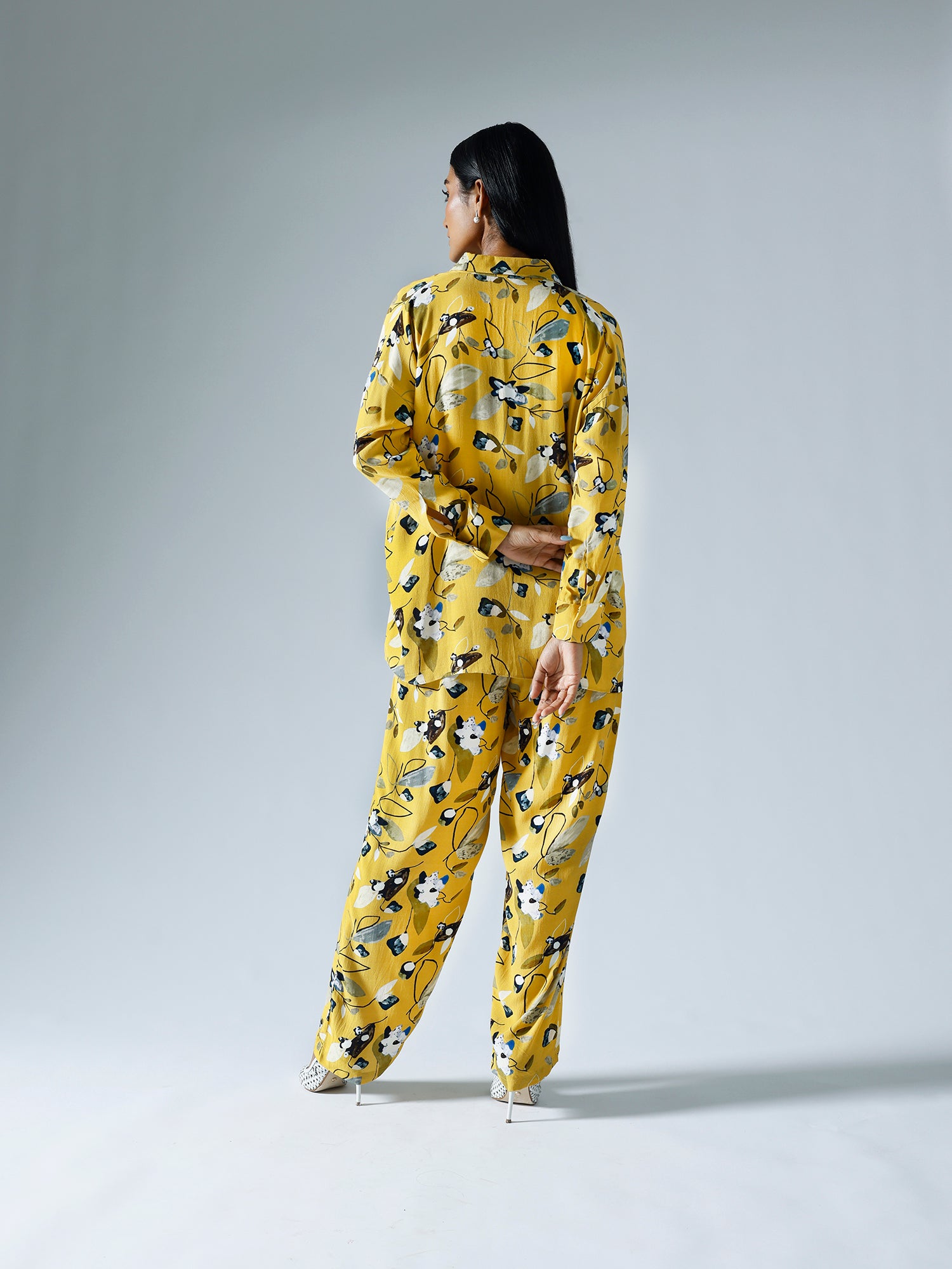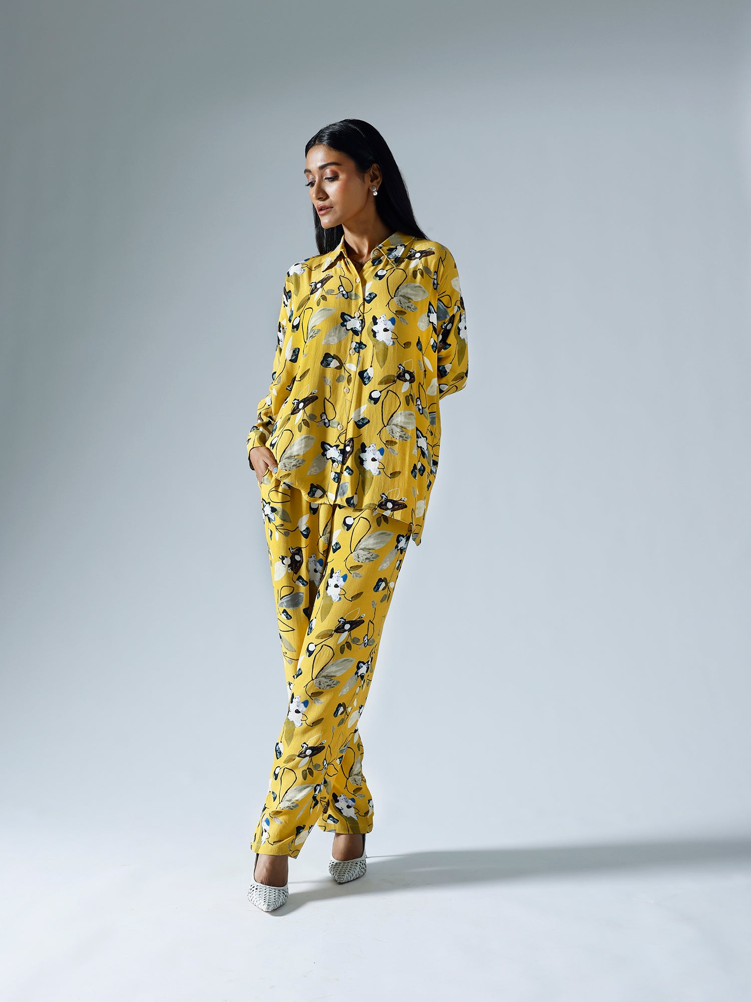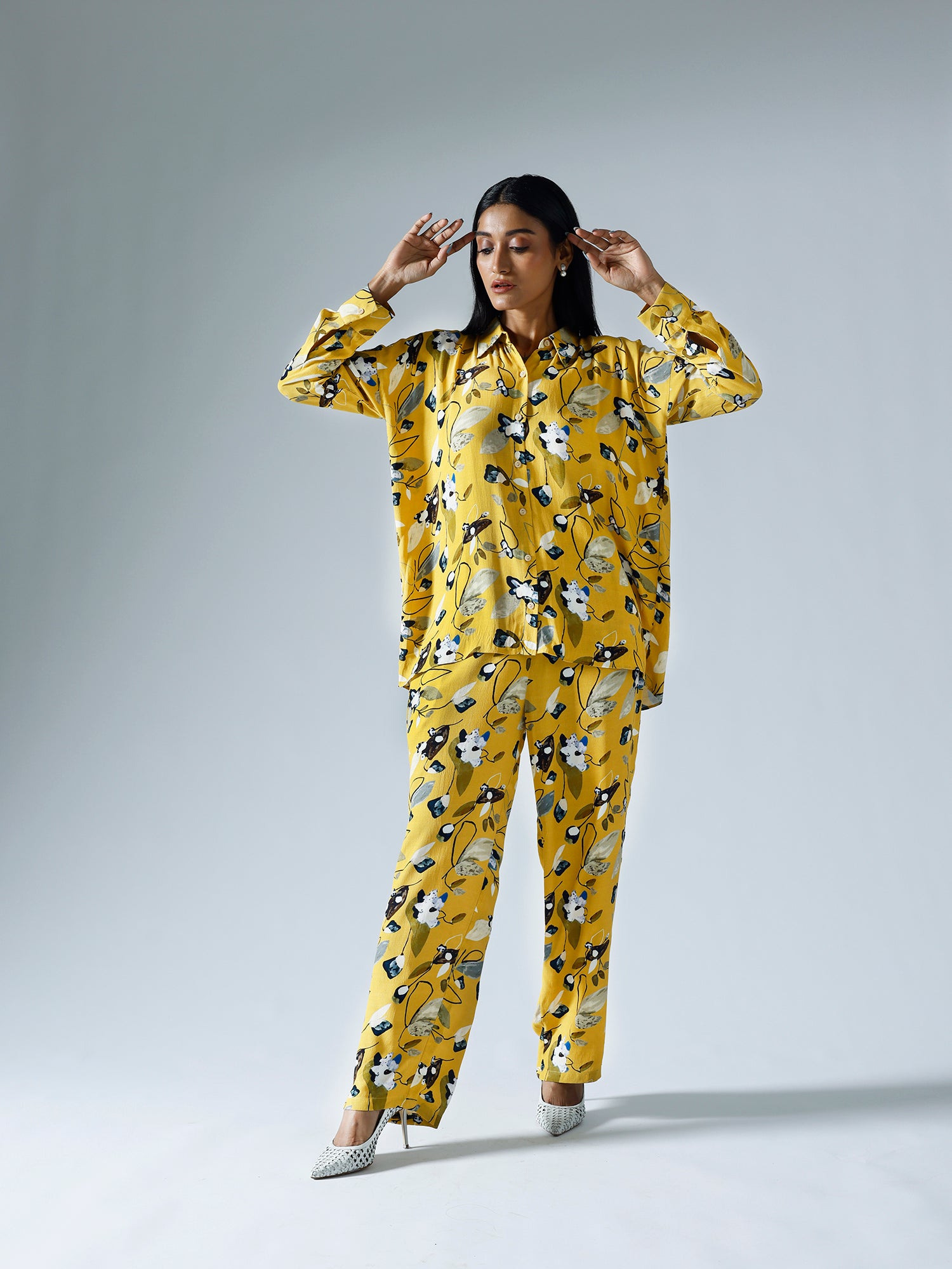 Box fit oversized shirt in full cuffed sleeves with front buttons. Pants with pocket and back elastic. Zip fly fastening with a single hook fastening on one side. Mid rise. Regular fit.