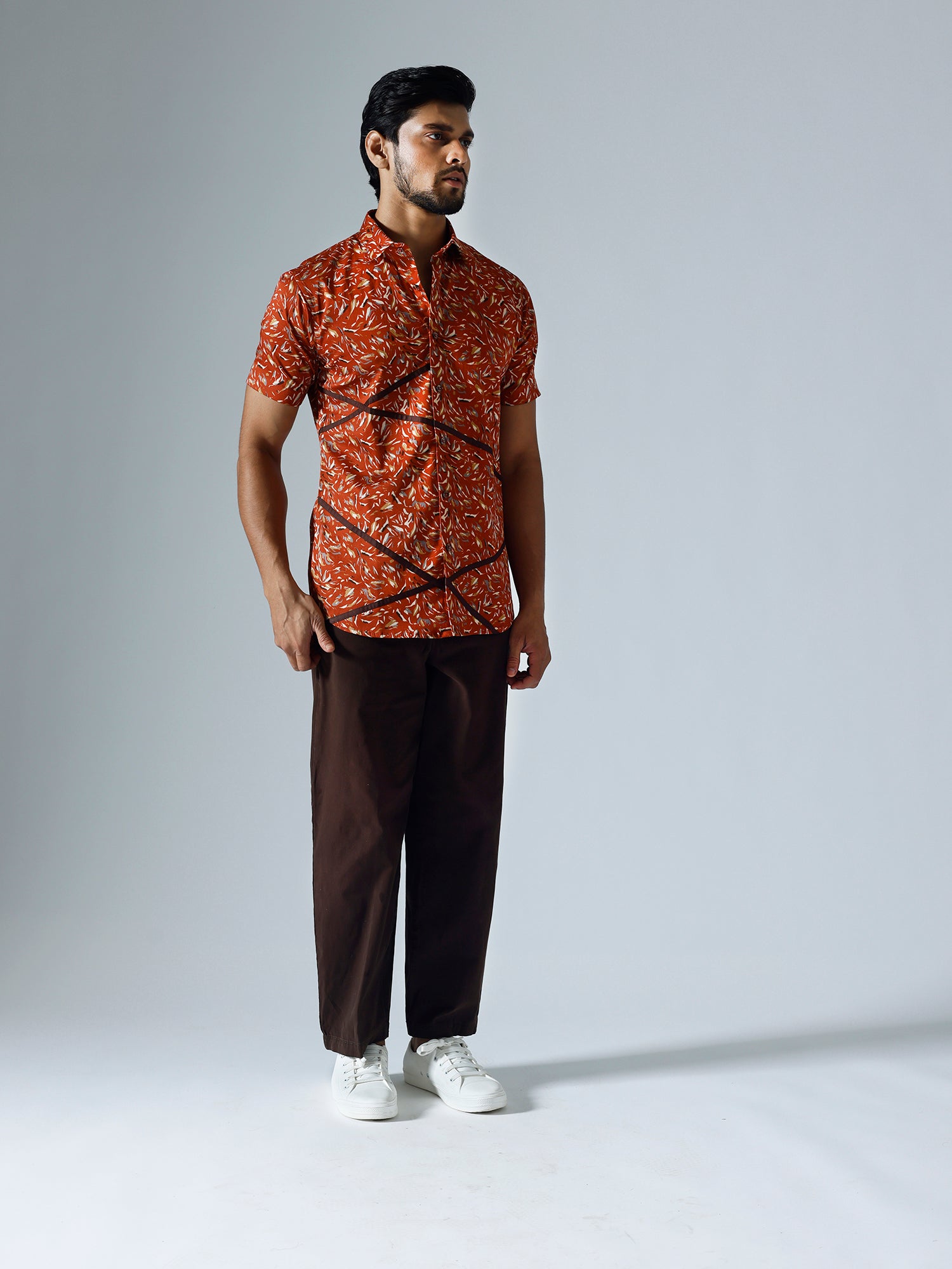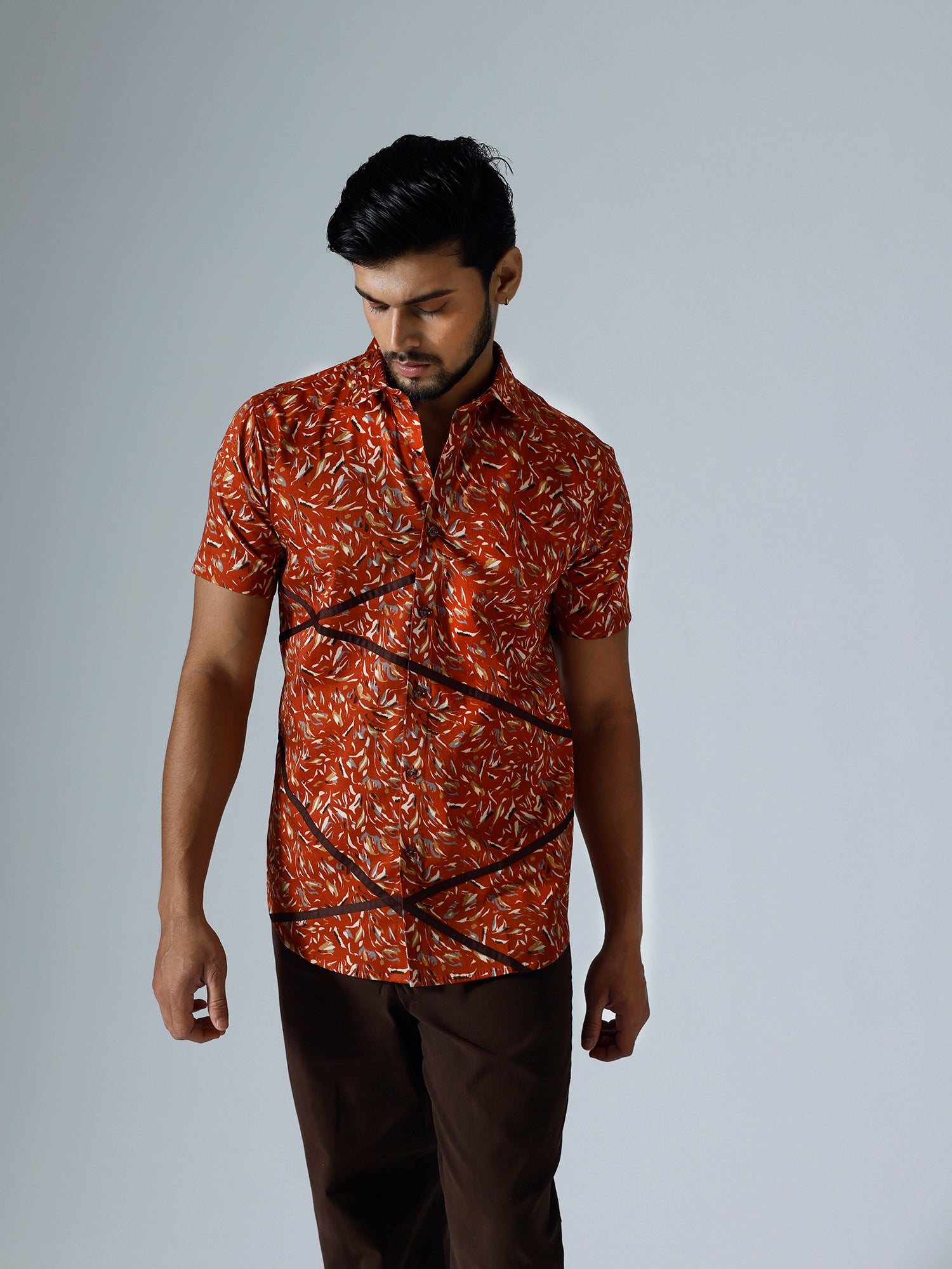 Printed red half sleeve Shirt with box stitch detailing on the fitted sleeve and brown highlighted criss-cross design feature at the forefront.